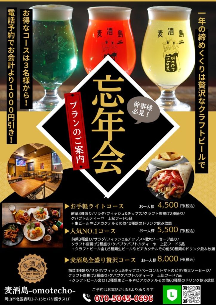 🎊忘年会、新年会など各種飲み会に対応可能な飲み放題付きコース¥4,500〜